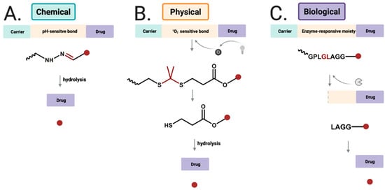 Drug release strategies for (A) chemical-responsiveDDSs by hydolysis of hydrazone bond to release free drug; (B) physical-responsive DDSs using near infrared light to generate singlet oxygen, which undergoes reaction with thioketal group; (C) biological-sensitive DDSs cleaved byenzyme, and further cleaved to release free drug.