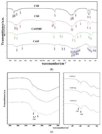 In the FTIR spectrum of the starting cement CAS5 powder mixture (Figure 1b), the ν3 and ν1 stretching vibrations of the group at 1063, 1031, 1008 and 987 cm−1; ν4 and ν2 deformation O–P–O vibrations; a symmetric stretching (962–941 cm−1) mode (ν1) of TTCP [36,37]; shoulders at 1128 and 897 cm−1 representing ν3 stretching vibrations of P–O and P–O(H) monetite bonds and OH plane bending monetite vibrations at 1409 and 1346 cm−1, were found [38]. Furthermore, only low intense CSH peaks (only traces of CSD) may be visible in the spectrum of the original powder mixture due to its low content at 1012, 658 and 1629 cm−1, which arise from the bending vibrations of SO4(ν1), SO4(ν4) and H2O [39]. After 7 days of soaking in SBF, the TTCP and monetite were transformed into nanohydroxyapatite with characteristic vibrations of the group—anti symmetric (ν3) and symmetric (ν1) P–O stretching vibrations at 1037, 1094 and 961 cm−1; O–P–O bending (ν4) vibrations at 565 and 602 cm−1, as well as a weak distinguished liberational mode of the OH group at around 629 cm−1, and a peak from stretching vibrations of the OH group at around 3556 cm−1. Moreover, bands corresponding to ν2 and ν3 vibrations of the group at 1460, 1412 and 874 cm−1 represent the B-type carbonated hydroxyapatite with a substitution for groups [40]. No peaks from any other phases were identified in the CAS5 spectrum (or CAS15, not shown) after setting.