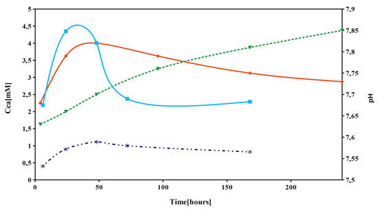 Similarly, a rapid rise in Ca concentration was observed after immersion of CAS5 cement in 0.9% NaCl solution at 37 °C for a maximum of 48 h. After 48 h of soaking, the fast decrease in calcium concentration to about half the value of the maximum was recorded. Note that a trace phosphorus concentration, not exceeding 0.1 mM, was measured during soaking. The Ca/P mole ratios in the starting CAS5 powder mixture and 7-day hardened cement were determined by ICP chemical analysis and were 1.75 ± 0.02 and 1.64 ± 0.03, respectively, which corresponds to the theoretical ratio in cement. From the comparison of dependences in Figure 3 four-fold increase of Ca concentration resulted in CAS5 compared to C solution and the pH of C solution gradually rose to 7.85.