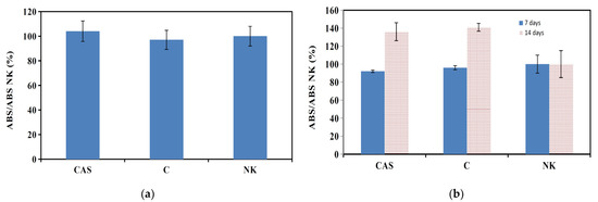 Viability of osteoblasts cultured in negative control (NK), CAS5 and C cement M1 extracts for 24 h (a) and M2 extracts for 7 and 14 days (b).