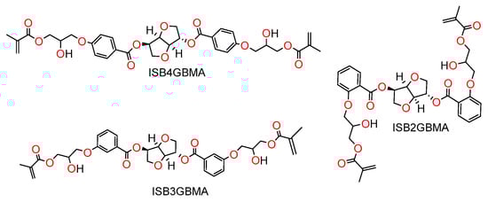 d-sorbitol 2,5-bis[2-(2-hydroxy-3-methacryloyloxypropoxy)benzoate] (ISB2GBMA). Their chemical structures are shown in