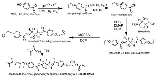 Since the synthesis of the para-, ortho-, and meta-substituted isosorbide 2,5-bis(glyceryloxybenzoate) dimethacrylates is similar, the para-substituted isosorbide 2,5-bis(4-glyceryloxybenzoate) dimethacrylate reaction scheme is given as an example in