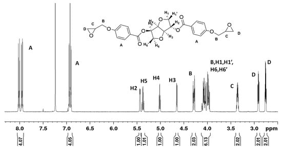 Isosorbide 2,5-bis(4-allyloxybenzoate) is further reacted with MCPBA to generate isosorbide 2,5-bis(4-glycidyloxybenzoate) (60% yield, >98% pure, mp 112–113 °C). 1H NMR (CDCl3-, ppm): 2.78 (2H, -CH oxirane), 2.93 (2H, -CH oxirane), 3.37 (2H, -CH oxirane), 3.9–4.1 (6H, 4H -CH2 isosorbide, 2H-CH2 glycidyloxy), 4.29–4.31 (2H, -CH2 glycidyloxy), 4.67 (1H, -CH isosorbide), 5.03 (1H, -CH isosorbide), 5.39 (1H,-CH isosorbide), 5.46 (1H-CH isosorbide), 6.94 (4H, -CH aromatic), 7.9 (2H, -CH aromatic), and 8.0 (2H, -CH aromatic).