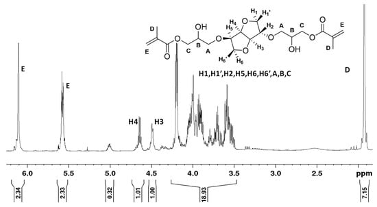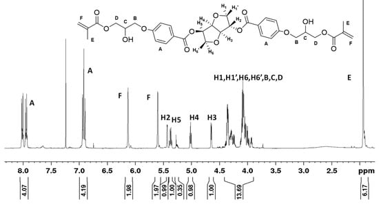 1H NMR spectra reveals that, during the final step of the synthesis of ISB4GBMA, the epoxide protons of the glycidyloxybenzoate intermediate at 3.37, 2.93, and 2.78 ppm disappear and give rise to methacrylate protons at 5.6 and 6.15 ppm, as shown in