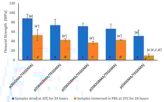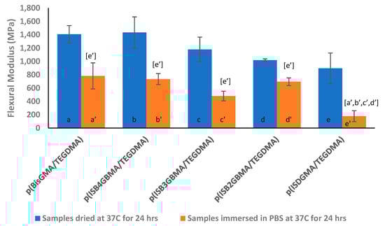 59]. The flexural modulus of p(ISDGMA/TEGDMA) was statistically significant from all samples in the immersed state. Similar to flexural strength, the limited number of sample sets per group may contribute to the findings of statistical analysis.