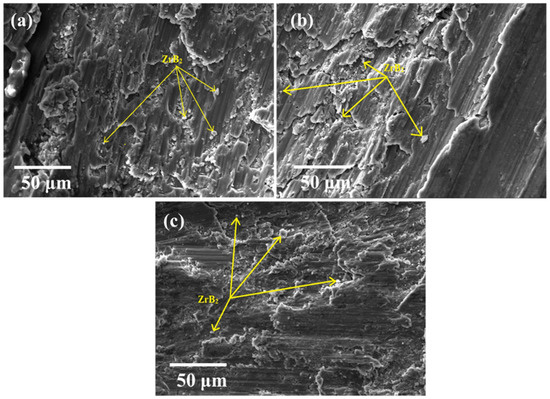 A sliding wear test was performed on a pin on a disc dry sliding tribometer. The samples are tested at different rpm (200, 400, and 600) and different load (10 N, 20 N, 30 N). The wear was measured in terms of worn height (µm). The wear tests were repeated three times for each type of material composition. The average of three wear was reported at different velocity and applied normal load. Figure 5 present the worn height of pure alloy and composite at different wt.% (0, 3, 6, and 9) of reinforcement with different RPM (600, 400, 200) and a constant normal load of 10 N. Similarly, Figure 6 and Figure 7 show the worn height of pure alloy and composites at 20 N and 30 N, respectively. It has been observed that as the amount of ZrB2 increases, the wear resistance of the composite also increases due to high microhardness and the good interfacial bonding between the reinforcement and the matrix alloy. This is due to the presence of embedded hard ceramic particles in the soft matrix. A similar observation on wear behaviours was also reported by Kumar et al. [20,26]. The wear rate is proportional to the normal load and sliding velocity. The difference in the coefficient of thermal expansion between ADC12 and ZrB2 reinforcement creates a strain field at the interface due to which ZrB2 particles restrict the expansion of the ADC12 matrix. This will result in the enhancement of dislocation density. This increment in dislocation density increases the hardness and wear resistance of the composites. As the load and speed are increases, friction between pin and disc also increases. This is the only reason behind the higher rate of material wear [23]. The nature of wear at low load and low sliding velocity was the combination of abrasion and delamination, whereas adhesion and softening/melt wear was observed at higher load and high sliding velocity.