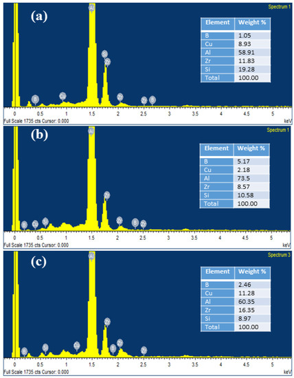 Energy spectrum produced by EDAX analysis for (a) 3 wt.% ZrB2 composites; (b) 6 wt.% ZrB2 composite; (c) 9 wt.% ZrB2 composite.
