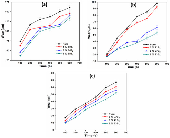 Variation of wear with time at 10N at (a) 600 RPM; (b) 400 RPM; (c) 200 RPM.