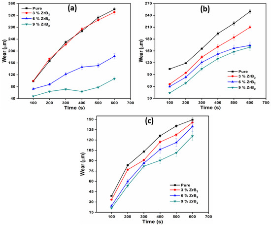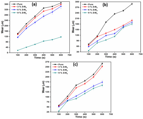 Variation of wear with time at 30 N at (a) 600 RPM; (b) 400 RPM; (c) 200 RPM.