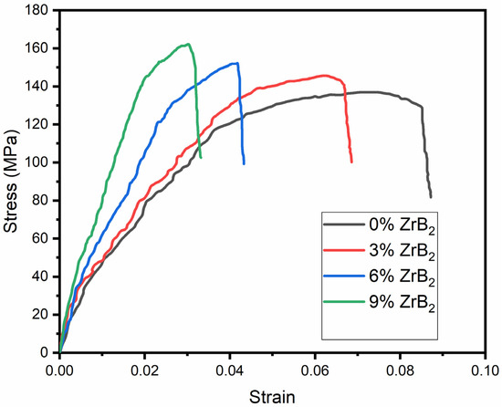 The tensile test was performed for determining the ultimate tensile strength (UTS) and yield strength (YS) of the material. It can be seen that the tensile strength of the material increased with an increase in the reinforcement of ZrB2 particles, whereas the ductility of the composite decreased, as seen from the stress-strain plot presented in Figure 8. Several strengthening mechanisms can be used to discuss the behaviours of the composites under tensile loading. Dislocation loads around the ZrB2 particles occur in the composites, which create the dislocation forest. Interaction between two dislocations is repulsive; hence, the materials’ dislocation will produce back stress for the further dislocation movement. Therefore, immense stress is required to cross through the dislocation forest. Ultimately it increases the strength of the material. According to the Hall–Petch relationship, grain refinement by ZrB2 can also provide additional strength to the material [10]. It is a method in which strength is provided by reducing average particle size. Whenever there is grain refinement, by applying the load, dislocation reaches the grain boundary; since atoms on the other side are oriented slightly, larger stress is required by dislocation to change its coarseness. This increases the strength of the material [27]. The ultimate tensile strength of the material increases by 6.8%, 11.4%, and 18.8% for 3%, 6%, and 9% ZrB2 composite, respectively, as compared to pure ADC12, as shown in Table 2.