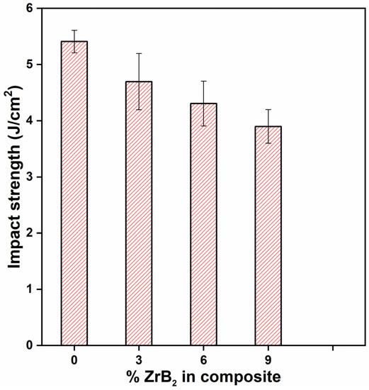 - As the amount of reinforcement increases, the material’s impact strength decreased because of the mixing of hard particles in the soft matrix. Impact strength of the material decreased by 12.9%, 20.3%, and 27.7% for 3%, 6%, 9% ZrB2 reinforcement, respectively, as compared to pure ADC12.