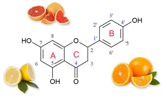 Naringenin (4,5,7-trihydroxy-flavanone) is one of the naturally occurring flavonoids from the polyphenol group. This flavanone is found mainly in citrus fruits, such as grapefruit (43.5 mg/100 mL), orange (2.13 mg/100 mL of juice) and lemon (0.38 mg/100 mL of juice) [1,2,3,4]. Naringenin can exist in two forms of aglycone or its glycosidic form (naringenin-7-O-glucoside). The formation of naringenin and other flavonoids in plants and fruits depends on many factors, including plant genetics and environmental conditions (soil type and light), as well as the degree of ripeness, processing and storage [5]. The pharmacological activity of naringenin has been proven. This compound has antioxidant, anti-inflammatory, neuroprotective, anti-cancer, anti-atherosclerotic and anti-diabetic properties [6,7,8,9,10,11].