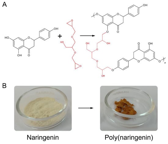 Proposed scheme of cross-linking reaction of naringenin with glycerol diglycidyl ether (GDE), where n—number of mers in poly(naringenin) (A); visual change of color of naringenin during polymerization with GDE (digital camera photos, Canon INC, Tokio, Japan) (B).