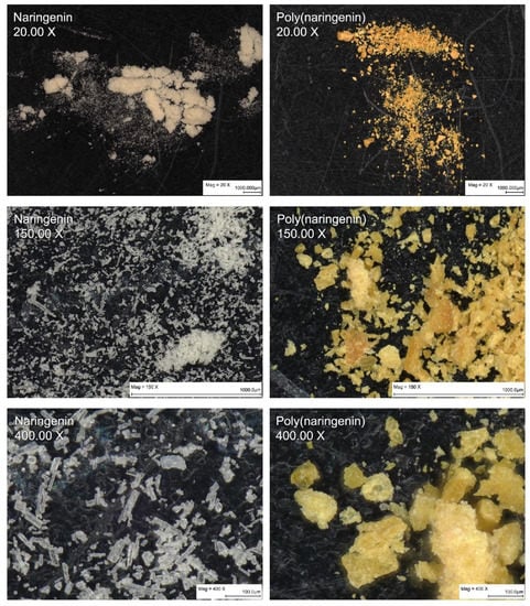 During the poly(flavonoid) formation reaction, a clear change in color of naringenin was observed (Figure 2b), as well as a change in its powder morphology (Figure 3 and Figure 4). Monomeric naringenin was characterized by a milky-white color, while poly(naringenin) was yellow-orange (Figure 2b and Figure 3).