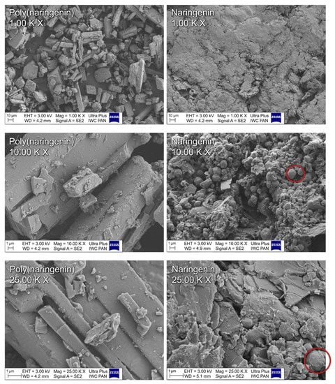 SEM images of naringenin and poly(naringenin) at 1.00 K×, 10.00 K× and 25.00 K× magnification. Red circles: ball-shaped structures.