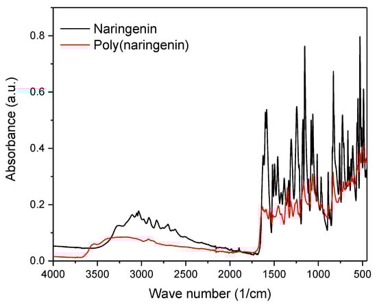 FTIR analysis: A Nicolet 670 FTIR spectrophotometer (Thermo Fisher Scientific, Waltham, MA, USA) was used to examine the structure of poly(flavonoid). Powders of monomeric naringenin and poly(naringenin) were placed at the output of infrared beams. The examination of oscillating spectra allows definition of the functional groups with which the radiation interacted. Based on the FTIR spectra, the degree of naringenin to poly(naringenin) conversion was determined.