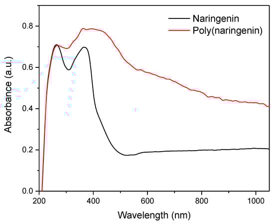 The polymeric naringenin was also confirmed by UV-Vis spectroscopy (Figure 6). The naringenin spectrum had two specific peaks at 200 to 300 nm and 300 to 400 nm. The poly(naringenin) powder was also characterized by two peaks: the peak between 200 and 300 nm, and a broad band between 300 and 550 nm. Literature reports suggest that the broad peak between 300 and 550 nm corresponds to the polymeric form of flavonoids, i.e., oligomeric catechin (300 to 550 nm) [38] and poly(catechin) received in the photopolymerization (300 to 750 nm) [16]. Similar results were obtained also for the poly(catechnin) obtained with the cross-linking compound. The polymeric form of catechin was characterized by two peaks, the first with a maximum at 250 nm and the second broad peak in terms of 300 to 900 nm [28].