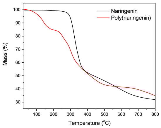 Thermogravimetric analysis (TG): the thermal stability of naringenin and poly(naringenin) was measured using a Mettler Toledo Thermobalance (TA Instruments, Greifensee, Switzerland). Powders of flavonoid and poly (flavonoid) (10 mg) were placed in alumina crucibles and heated from 25 °C to 800 °C under argon flow (50 mL/min) at a rate of 5 °C/min.