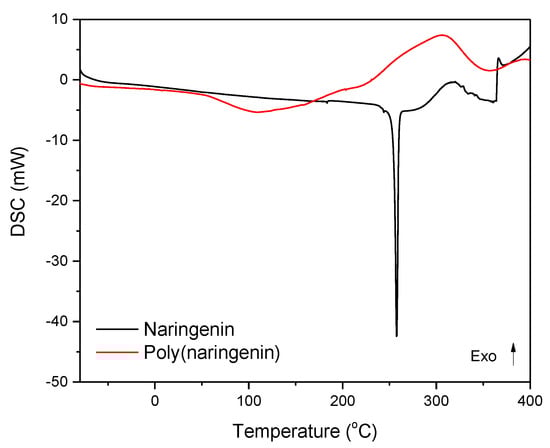 The poly(naringenin) powder obtained was exposed to differential scanning calorimetry (DSC). The powders were heated from −80 to 400 °C at a rate of 10 °C min in an air atmosphere. For comparison, the DSC of the reference naringenin was performed. The results are shown in Figure 8 and Table 2.