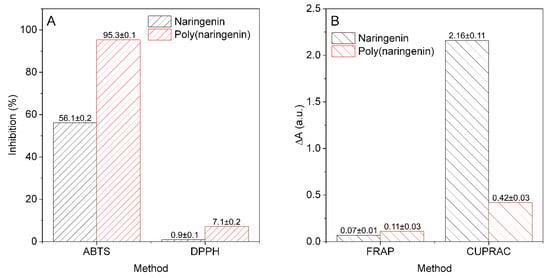 where A0 is the absorbance of the reference sample without naringenin and poly(naringenin), and A1 is the absorbance in the presence of naringenin or the polymeric form of naringenin [28]. Absorbance was measured at 734 nm for the ABTS method and at 517 nm for the DPPH test using a UV spectrophotometer (Evolution 220, Thermo Fisher Scientific, Waltham, MA, USA).