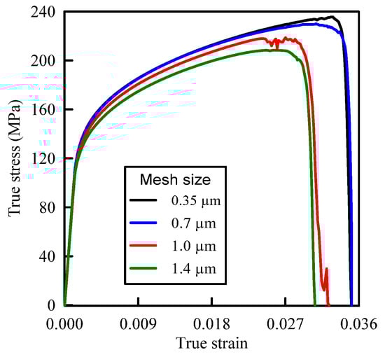 Convergence of the present FE model is checked by carrying out the simulations using four different FE meshes with 2D plane strain elements of sizes 0.35, 0.7, 1.0, and 1.4 µm. The predicted true stress–strain curves for A359/SiC composite with a particle size (PS) of 10 µm and volume fraction (VF) of 10%, shown in Figure 1, are plotted in Figure 2. The representative model in Figure 1 has a length and a width of 240 and 120 µm, respectively. Table 1 provides the extracted values of the ultimate tensile strength and the failure strain of the specimen. It is depicted that the present simulations give stable results with mesh sizes of 0.35 µm and 0.7 µm. Accounting for the accuracy of results and the computational cost, the FE mesh of size 0.7 µm is selected for all forthcoming simulations.