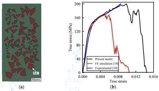 To verify the present computational FE model, consider the A359/SiC composite with the microstructure shown in Figure 3a. The predicted true stress–strain curve of this composite under tensile loading of of 10 µm and those experimentally and numerically reported in [19] are illustrated in Figure 3b. It is depicted that present predictions are in accordance with the experiment. The present value of the modulus of elasticity (99.8 GPa) is very close to its numerical (102.6 GPa) and experimental (98.6 GPa) predictions [19]. In addition, the present model predicts an ultimate tensile strength (UTS) of 200.23 MPa, which is in good agreement with its experimental value (210 MPa) [19]. The numerical value of UTS predicted in [19] was 171.69 MPa which is smaller than that of the pure A359 alloy (182 MPa).