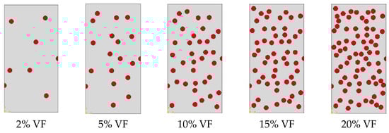 The effect of VF of SiC particles is investigated by considering different microstructure including different VFs, i.e., 2%, 5%, 10%, 15%, and 20%, as shown in Figure 4. The particles are randomly distributed within the matrix, such that keeping the particles size constant at 10 µm, the positions of SiC particles at 2% VF are kept fixed for 5, 10, 15, and 20% VFs and those at 5% VF are kept fixed for 10, 15, and 20% VFs and so on.