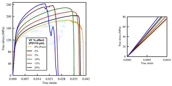 Effect of SiC particles volume fraction on the true stress–strain curve of A359/SiC composite (particle size (PS) = 10 µm).