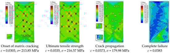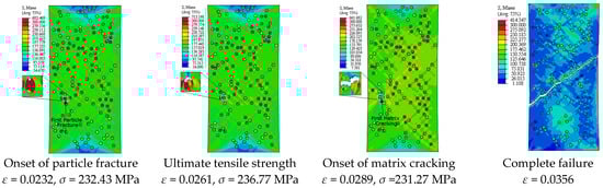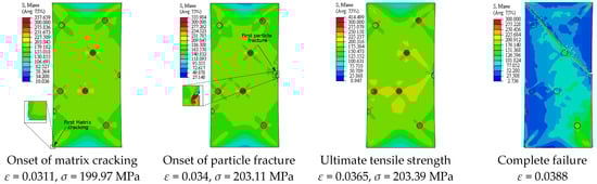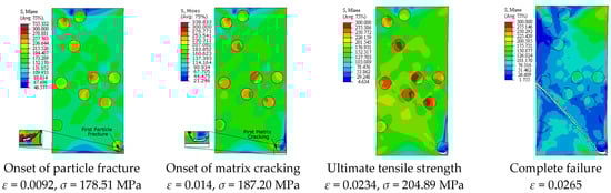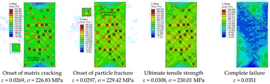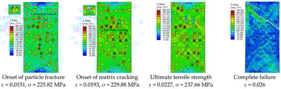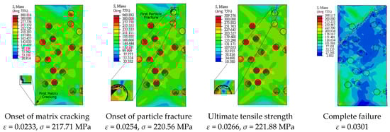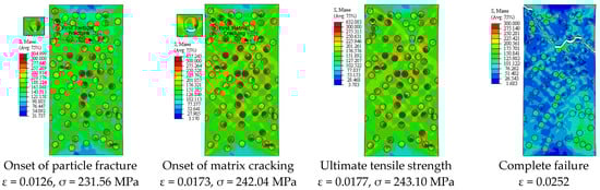 Figure 5 depicts the simulation results of the true stress–strain curves at different VFs. The influence of VF on the modulus of elasticity, yield strength, ultimate tensile strength, and failure strain is provided in Table 2. The damage mechanisms and consequences of failure including the onset of each failure mode are presented in Figure 6, Figure 7, Figure 8, Figure 9 and Figure 10 at 2%, 5%, 10%, 15% and 20% VFs of SiC particles, respectively. The applied load (true strain) needed for initiation of each mode of failure as well as reaching the UTS and the associated true stress (MPa) are recorded. The effect of VF of SiC particles on the distributions of the effective plastic strain within the matrix material at the onset of matrix cracking and the complete failure are depicted in Figure 11.