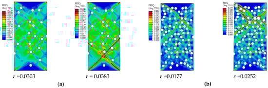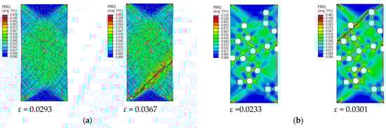 The distribution and maximum equivalent plastic strain are considerably influenced by varying VF of SiC, as illustrated in Figure 11. By varying VF from 2% to 10% and from 10% to 20%, the maximum plastic strain is reduced by 18.1% and 55%, respectively, at the onset of matrix cracking, and is increased by 7.4% and 24.6%, respectively, at the complete failure of the composite. It is also observed that for a given applied strain, the equivalent plastic strain increases as VF of SiC increases.