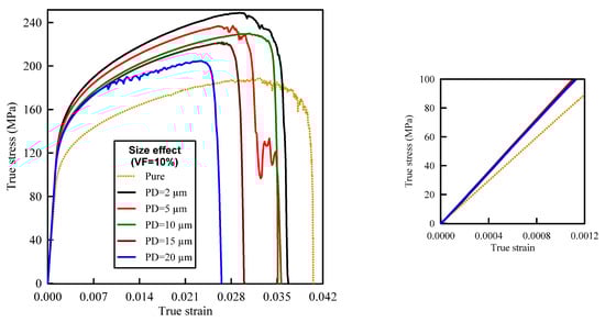 The influence of the SiC particle size (PS) on the deformation and damage behaviors of A359/SiC composite is investigated accounting for different microstructures including different PS of SiC particles, as demonstrated in Figure 12. In these microstructures, the positions of SiC particles within the matrix are randomly distributed keeping a constant 10% VF.