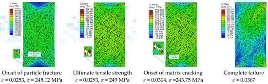 Considering the influence of SiC VF on the damage evolution, it is demonstrated from Figure 6, Figure 7, Figure 8, Figure 9 and Figure 10 that no decohesion is observed along the particle/matric interface, which is owing to the strong bond between the matrix and particles at all the studied values of VF. The damage mechanism starts with matrix cracking at low VF up to 10% and with a particle fracture at 15% and 20% VF. In other words, increasing VF raises the possibility of particle fracture, which is due to the modulus of elasticity increasing by the increasing VF, and consequently, the stress level becomes higher. Additionally, the particles exhibit no fracture at 5% VF, which may be owing to the random arrangement of particles in the matrix, as depicted in Figure 7. The obtained results show that the initiation of matrix cracking occurs just before the stress level approaches UTS, regardless of the VF of SiC particles. Increasing VF of SiC particles reduces the true strain needed to the onset of matrix cracking and in accordance increases the corresponding stress. The true strain corresponding to UTS decreases as VF increases. When the stress level exceeds UTS, the matrix is highly deformed and in turn, the matrix crack propagates at 45° along the applied displacement. Therefore, the stresses are considerably released on the crack sides and new matrix cracks are detected. These microcracks extend through the composite and grow until complete separation occurs. As mentioned before, the strain required for complete failure (failure strain) is noticeably reduced by increasing the VF of SiC particles. In addition, von Mises stress in the composite increases as the particle content increases due to the same reason of enhancing the modulus of elasticity.
