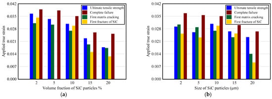 It is observed from Figure 19 that both VF and PS of SiC particles considerably influence the needed strain for onset of different damage modes of A359/SiC composite. The required true strain for reaching the ultimate tensile strength, initiation of matrix cracking, the onset of particle fracture, and the complete failure are, respectively, reduced by 15.7%, 13.7%, 13.4%, 9.6% when VF of SiC changes from 2% to 10% and by 42.4%, 35.7%, 57.6%, 28.3% when VF changes from 10% to 20%. As PS of SiC increase from 2 µm to 20 µm, the required true strain for the initiation of cracking in matrix and particle fracture, approaching the ultimate strength, and the occurrence of complete separation are reduced by 54%, 63.5%, 20.1%, and 27.8%, respectively.