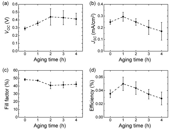 Figure 2 shows the changes in VOC, JSC, fill factor, and efficiency of eco-friendly DSSCs depending on aging time. The VOC and fill factor did not change significantly over time, while JSC and the resulting efficiency were highest at 1 h of aging time and then gradually decreased. The possible reasons for the decrease in JSC are the following: (1) dye degradation [16,17,18], (2) dye detachment from the TiO2 surface into the electrolyte by strong adsorption of water molecules onto the TiO2 [19,20], and (3) recombination by contact of the dye-free TiO2 surface with aqueous electrolytes [15]. A further experiment is now underway to improve the stability of the eco-friendly DSSCs by selecting more durable, commercially available organic dyes.