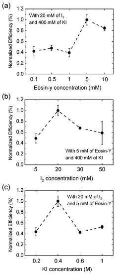 Effect of dye-electrolyte concentration on efficiency according to (a) concentration of eosin-Y dye, (b) concentration of I2, and (c) concentration of KI. The efficiency values were normalized based on that with the dye-electrolyte including 5 mM eosin Y dye, 0.4 M KI, and 0.02 M I2.