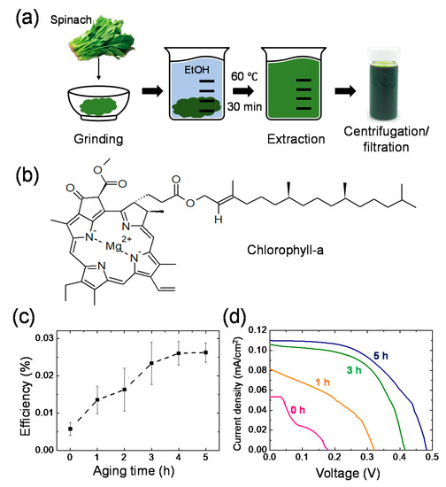 (a) Process of chlorophyll extraction from spinach. (b) Molecular structure of chlorophyll-a. (c) Change in the efficiency of the eco-friendly DSSCs with chlorophyll depending on the aging time and (d) corresponding J–V graphs.