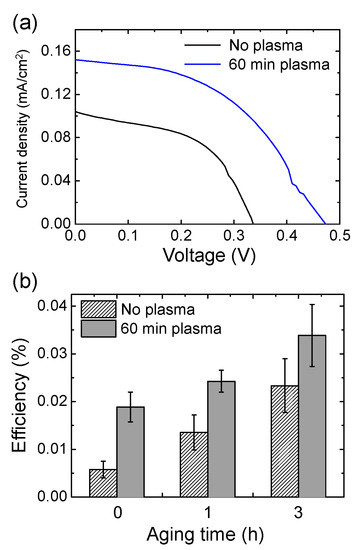 We investigated the effect of the plasma treatment of the TiO2 photoanode on the photovoltaic performance of the eco-friendly DSSCs based on chlorophyll. It was also reported that chlorophyll was better adsorbed onto the plasma-treated TiO2 surface due to the reduction of the oxygen vacancies [25,30]. The TiO2 photoanode of the eco-friendly DSSCs was treated with air plasma for 60 min before chlorophyll staining. Figure 6 and Table 3 compare the photovoltaic characteristics of the chlorophyll-based DSSCs with and without the plasma treatment. Both VOC and JSC increased after the plasma treatment for 60 min. As a result, when compared at 3 h of aging time, the plasma treatment improved the efficiency by ~50%. Notably, the resulting efficiency was comparable to those of the previously reported chlorophyll-based DSSCs with non-aqueous electrolytes [31,32,33]. The efficiency was still low, even compared to the eosin-Y-based DSSCs in Figure 4d. This was largely due to the low current density and needed to be significantly improved for practical use. According to the literature [34], 10 g of spinach contains 6.91 mg of chlorophyll. In this study, if we assume that all of the chlorophyll molecules in spinach were completely extracted, the maximum molar concentration of the chlorophyll staining solution was ~0.052 mM. Therefore, the actual concentration should be relatively low compared to the typical concentration for dye staining of DSSCs [35,36,37]. The efficiency of the eco-friendly DSSCs could be further improved by optimizing the conditions of the chlorophyll staining and the plasma treatment.
