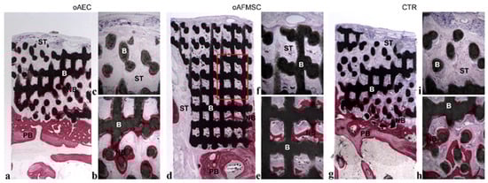 At low magnification, the samples of all groups showed the residual biomaterial block in contact with the pre-existing bone, that partially retained its interconnected porous microstructures (Figure 1a,d,g).