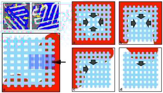 Study approach of the morphometric parameters vs. distance from native surrounding bone. (I–II) Sampling slices of casual samples: yellow arrows indicate strict contact of the scaffold with surrounding native bone. Dark grey: bone; light grey: scaffold. (a–d) Possible sample settings: (a) Native bone fully surrounds the scaffold; (b) Native bone surrounds the scaffold from three sides; (c) Native bone surrounds the scaffold from two sides; (d) Native bone surrounds the scaffold from only one side. (e) Concept for the selection of the Volumes of Interest (VoIs): 5 VoIs of 1.6 × 1.6 (base) × 0.4 (thickness) mm3 were selected, the first centered in one side where the scaffold was in strict contact with the native bone, the following going towards the bulk of the scaffold. Red: bone; light blue: scaffold.