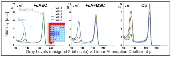 Profiles of the intensity counts vs. gray levels (proportional to the linear attenuation coefficient µ) in representative samples of each group. The integrated areas of the represented peaks correspond to the newly formed bone (left peak) and to the scaffold (right peak) (a) in the oAEC-group, (b) in the oAFMSC-group, and (c) in the Ctr-group.
