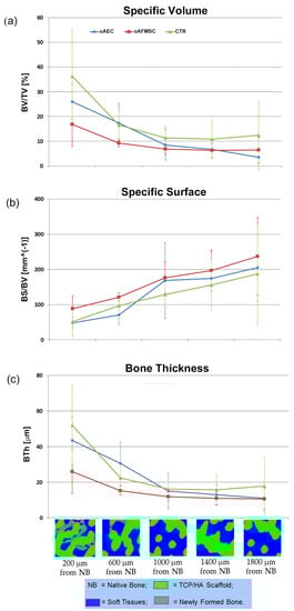 The analysis was continued, checking if the previous morphometric results were re-liable or affected by the specific scaffold dimension/distance to the native surrounding bone tissue. In other words, it was verified if predominant was the action of the seeded stem cells or the osteoconduction action of native surrounding bone. This result was achieved approaching the study of the morphometric parameters vs. distance from native surrounding bone, as shown in Figure 2.