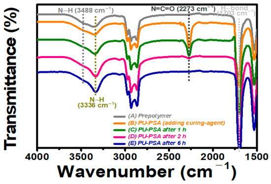 The preparation of PU-PSA by the addition of a curing-agent was confirmed by FT-IR spectroscopy. Figure 1 shows the FT-IR spectra in a synthetic procedure of PU-PSA. The two absorption peaks at 3488 and 3336 cm−1 were assigned to the asymmetric and symmetric N–H stretching of the urethane group, and the intense band at 1598 cm−1 was assigned to the in-plane N–H bending of the hard segments. As shown in Figure 1, the characteristic absorption peaks for N=C=O were observed at 2274 cm−1, which strongly appears in (B), slightly vanishes in (C), almost vanishes in (D), and vanishes completely in (E) due to the end-capping and entire reacting of N=C=O. FT-IR region of 1670–1750 cm−1 can be assigned to C=O stretching, which may be related to the hydrogen-bonded C=O (hydrogen bonding between C=O and N–H) of urethane linkage and the absorbance of 1720 cm−1 may be related to free C=O group [16,17,18]. The contribution of H-bonding by urethane groups increased with increasing the hard segment, as shown in Figure 1. Hence, all reactants after adding the curing-agent react completely to produce the PU-PSA.