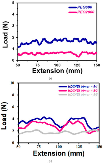 The effects of the molecular weight (MW) on the sticking-strength were studied to tune the holding power under different application conditions. Figure 2a shows the peel strength patterns of PU-PSA depending on the different PEG MWs during the 180° peel test. As shown in Figure 2a, both curves by different MWs of PEG 600 and 2000 showed that a stable sticking-pattern within the peel strength occurred in the range from 50 to 150 mm extension. A low MW value can enhance the sticking-strength of PU-PSA because of the larger crosslinking points and crosslinking density. This could also be induced by increased H-bonding. Figure 2b presents the bonding strength that forms instantly between the PU-PSA and glass adherend as a function of the HDI/HDI trimer ratio. After the HDI/HDI trimer ratio was changed from 9/1 and 8/2 to 5/5, the peel force decreased to 2.89 Ncm−1 and 1.48 Ncm−1, respectively. The strong bonding strength may lead to the generation of rough surfaces that occur during the attachment to and detachment from the adherend. The tacky properties of PU-PSA are dependent on the HDI/HDI trimer to resin-formulation ratio, as a high HDI content produces a relatively strong but sticky adhesive. In contrast, a high HDI trimer content generates a relatively soft but non-sticky adhesive.