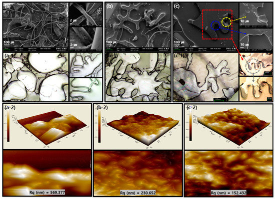 FE-SEM, optical microscopy and AFM images of PU-PSA interfaces after detachment to the adherend; (a), (a-1), (a-2): HDI/HDI trimer = 9/1, (b), (b-1), (b-2): HDI/HDI trimer = 8/2 and (c), (c-1), (c-2): HDI/HDI trimer = 5/5.