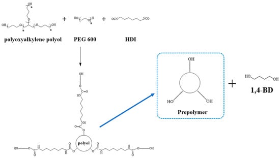 Polyethene glycol (PEG, Mn = 600 and 2000 g/mol, Tokyo Chemical Industry Co., Ltd., Tokyo, Japan) was used as a first polyol. Hexamethylene diisocyanate (HDI, Tokyo Chemical Industry Co., Ltd., Tokyo, Japan) and HDI-based polyisocyanate trimer (Aekyung Chemical Co., Ltd., Seoul, Korea) were used as the aliphatic diisocyanate and co-diisocyanate, respectively. 1,4-butanediol (1,4-BD, Junsei Chemical Co., Ltd., Tokyo, Ja-pan) and polyoxyalkylene polyol (KPX Chemicals, Seoul, Korea) were used as the second polyol. The polyols were melted and dried at 80 °C in a vacuum oven for three hours before use.
