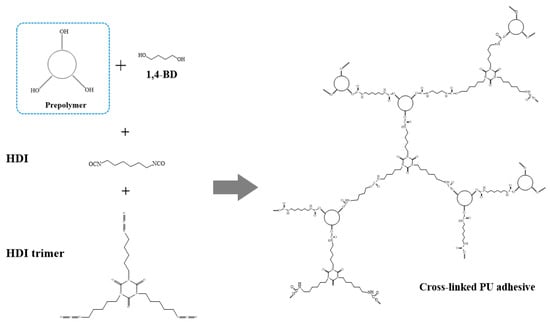 A polyurethane pressure-sensitive adhesive (PU-PSA) was synthesized using the prepolymer method in a 500 mL four-neck round-bottom glass reactor under N2 purging conditions. 7.00 g of HDI was melted at 70 ℃, and 3.33 g of PEG + 20.00 g of polyoxyalkylene polyol was added under mechanical stirring of 250 rpm. The chain extender (1.00 g of 1,4-BD) was added sequentially, and the mixture is stirred at 70 °C and 80 rpm for one hour. To prepare the PU-PSA, 10.00 wt.% of HDI and HDI-based polyisocyanate trimer mixture were poured into the PEG + HDI + polyoxyalkylene prepolymer and allowed to cure for five minutes at room temperature. Scheme 1 and Scheme 2 present the synthetic and curing procedures of PU-PSA, respectively.