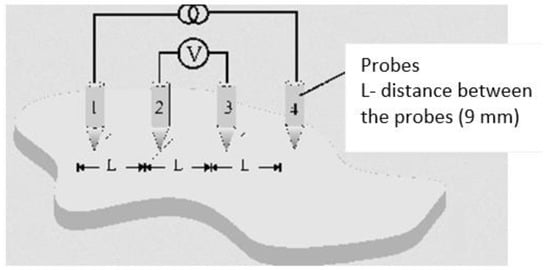 For each sample, the surface resistance of the material was measured by means of the four-point method. In the measurements, four electrodes disposed on the same axis at equal distances from one another were used. The scheme of electrode placement is shown in Figure 1.
