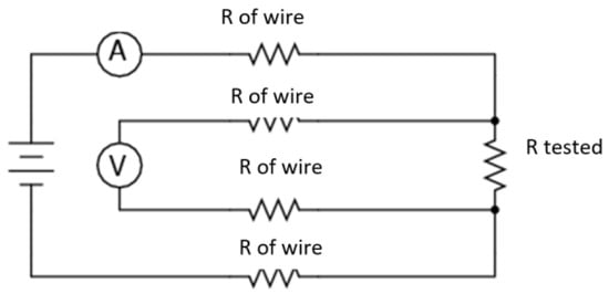 Due to the different widths of the electrically-conductive materials, measurements were made for each material on 4 mm wide strips, and then the appropriate conversion to surface resistance was applied. For each sample, five measurements were performed. Then, the results for each sample were averaged, and the result was taken as the final value for the sample. In Figure 2, the equivalent circuit of electrical connections in the method used for measuring the surface resistance of electro tracks is shown.