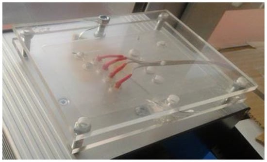 The electrodes to which wires for connection of multimeter had been soldered was placed in the holes. The whole construction was additionally protected by another pane of acrylic glass screwed to the main one. Such a construction enabled placing the burden on it (Figure 5). In measurements, a pressure induced by 1.25 kg of weight was used. The measurements were carried out using two Keithley multimeter sourcemeters 2420 in the atmosphere, for the following parameters: temperature 25 °C, relative humidity 45%.