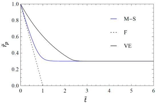 The dimensionless radius as a function of dimensionless time for the Frenkel model (F), the (modified) Mackenzie and Shuttleworth model (M–S) and the viscoelastic model (VE) are compared in Figure 2. Equations (13) and (14) were solved numerically using Wolfram’s Mathematica [19].